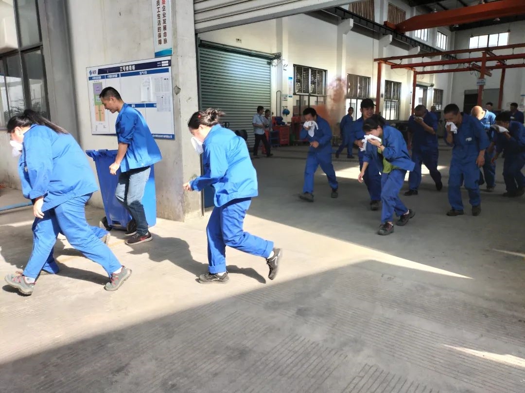 三組人員歸位后,工作人員燃煙,使廠內冒出濃煙。警鈴響起,只見大家一個個表情嚴肅,彎著腰,用濕毛巾捂住口鼻,迅速而有序的從通道口撤離“火災"現(xiàn)場。樓內疏散人員按照預先的消防演習方案疏散員工,保證樓內員工的安全,以免因慌亂而出現(xiàn)踩踏事件。